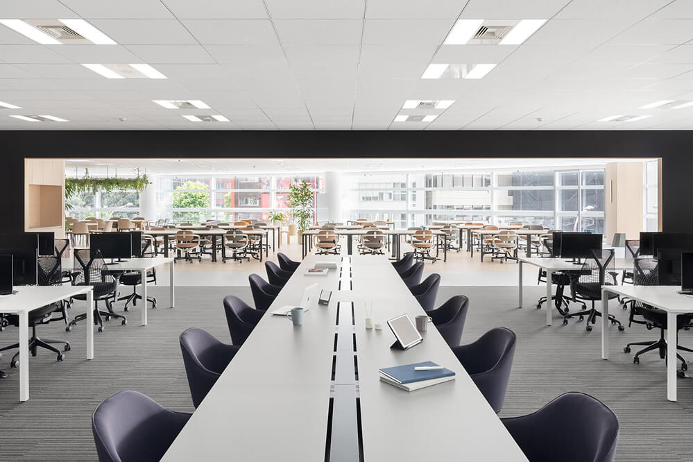 オフィスの執務エリアは、部門内のコミュニケーションをよりスムーズに、また、新たに入社した方を部署メンバーがいつでもフォローできるように、事業本部、本部単位で座席エリアを設定する「チームアドレス」を導入しています。