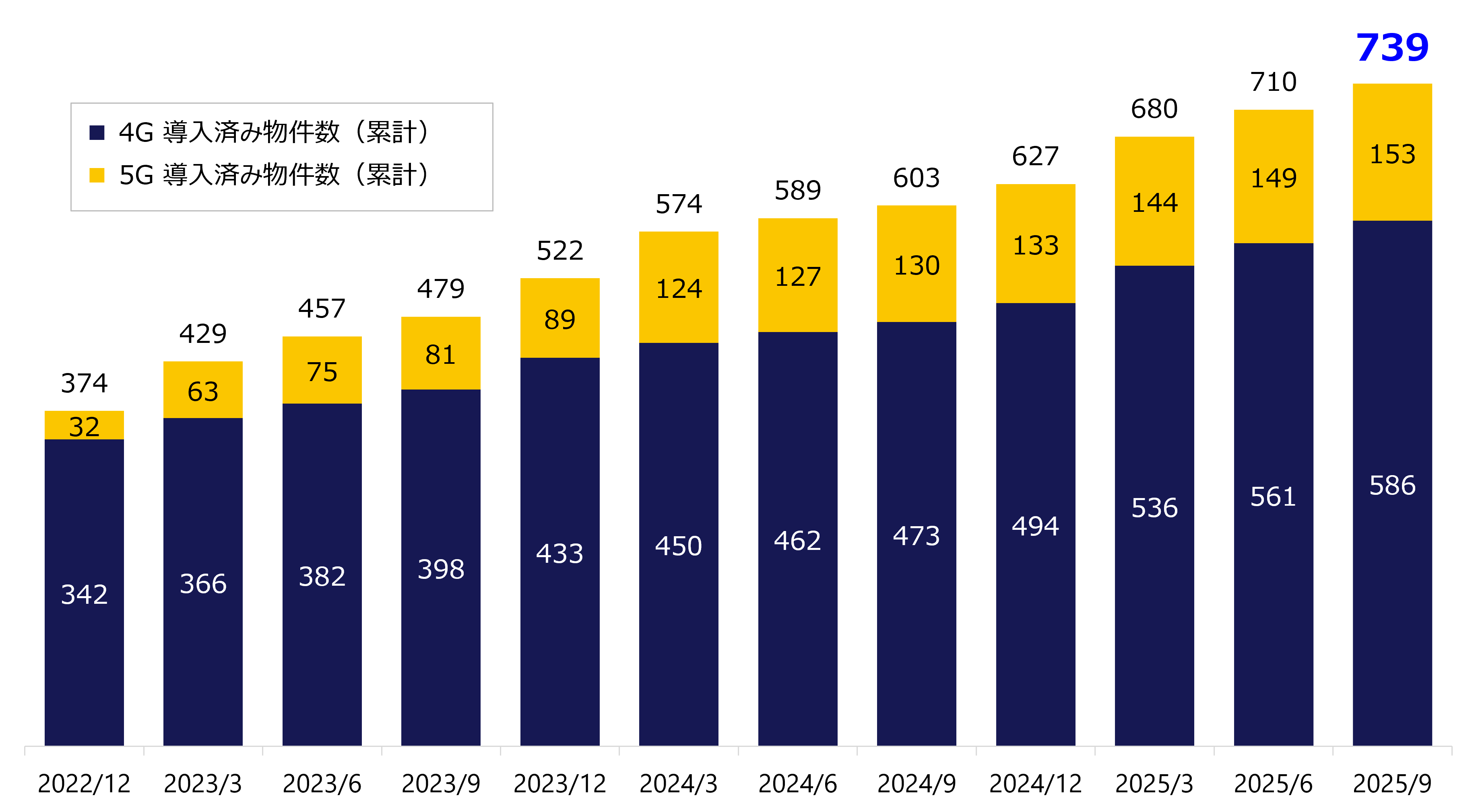 2025年9月時点の累計導入済物件数(4G/5G、国内)は739件(前年同期比123%)となりました。